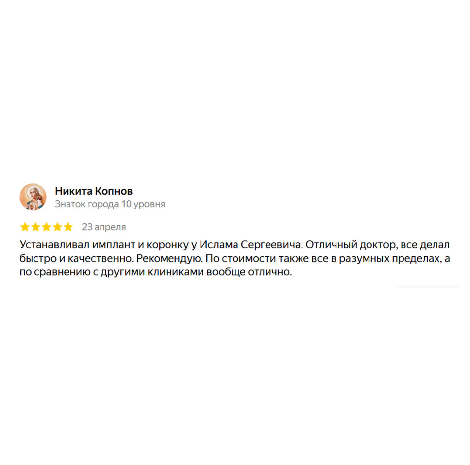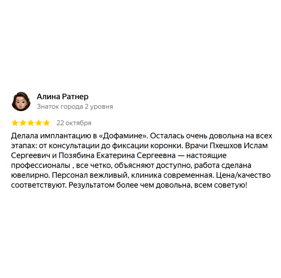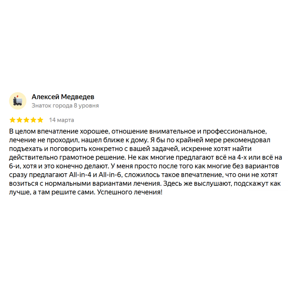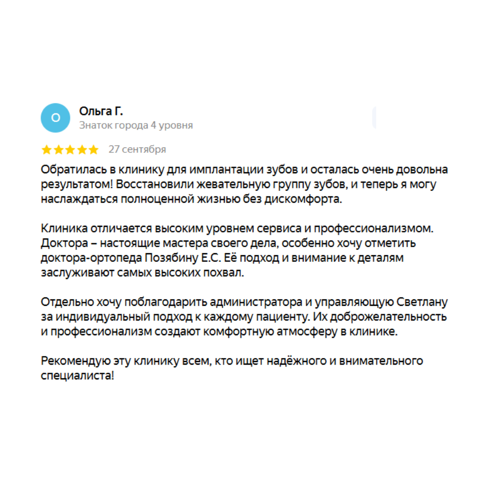 "Многие отмечают исключительный профессионализм врачей: Пациенты довольны качеством лечения (терапия, протезирование, имплантация) и отмечают, что врачи дают подробные рекомендации по дальнейшему уходу.